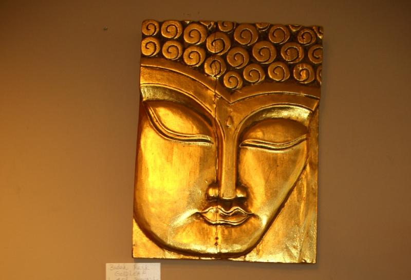 Buddah Mask Gold Leaf on Natural Wood $48 size is 24" H x 11" W