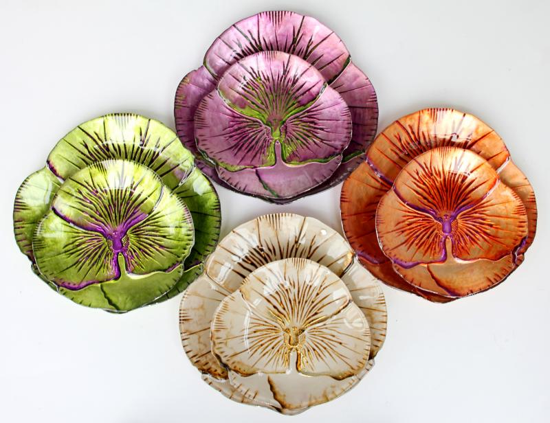 Inspired by the love of my Garden the Pansy Plates in this picture come in two sizes: 8.5" Desert or salad plate $21 each or the Canapé plate 6.5" for $15 each mix and match the colors to brighten up your summer table.