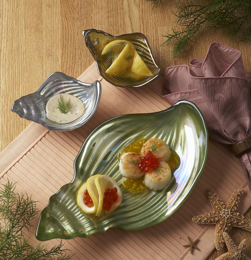 Above: Shell serving tray in fused glass gold or silver leaf, 11.5" rectangle tray $43.75